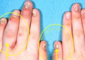 Figura 25. Artritis psoriásica. 1° dedo mano derecha en telescopio (artritis mutilante). Afectación de IFDs de ambas manos con subluxación de 3° IFD de mano izquierda. Onicopatía psoriásica.